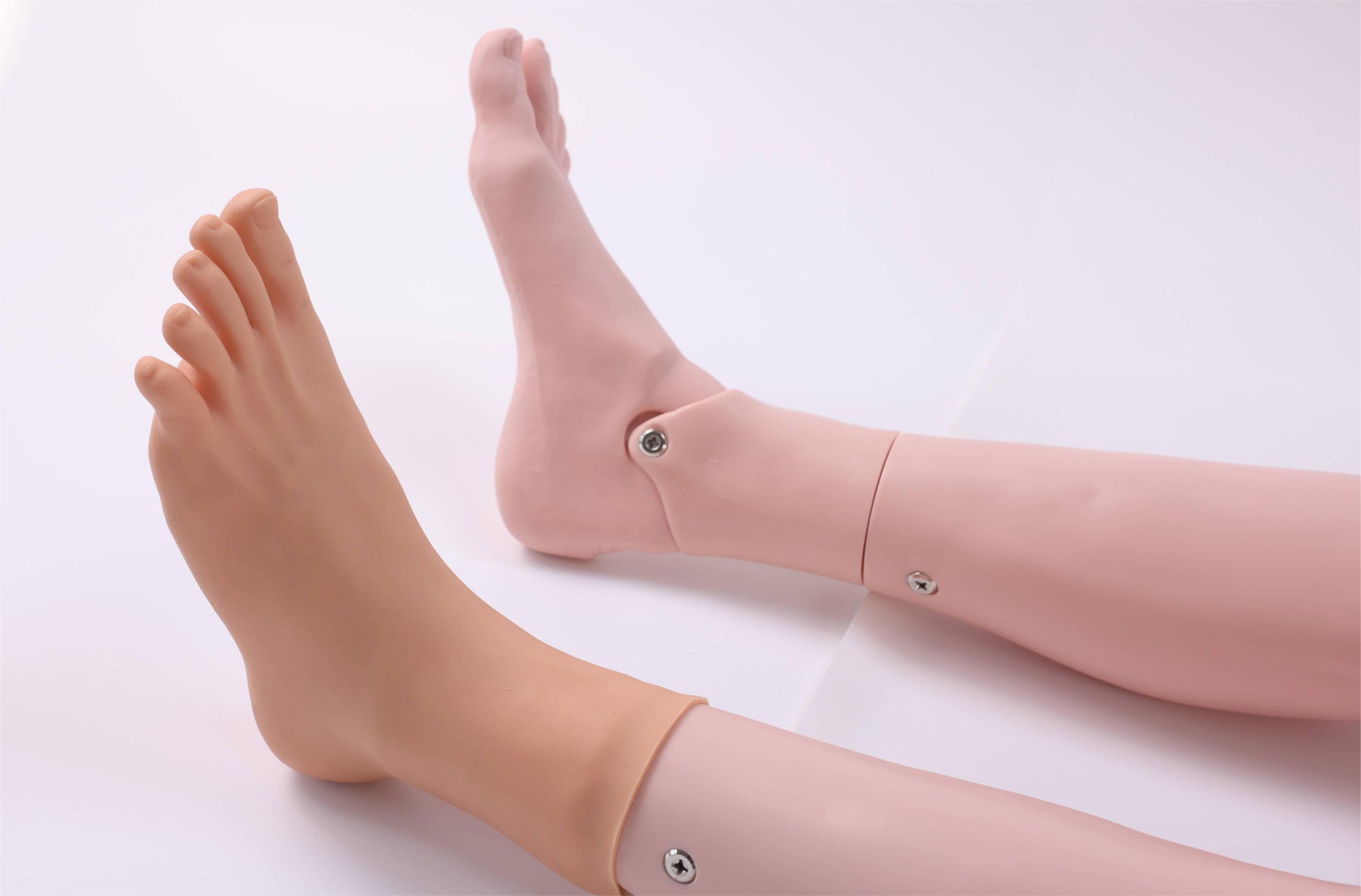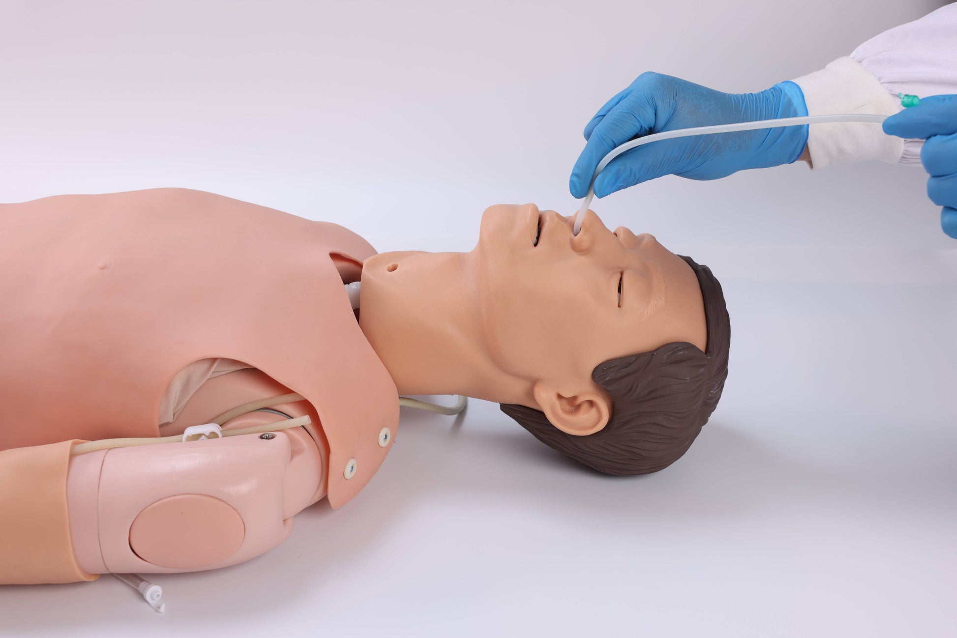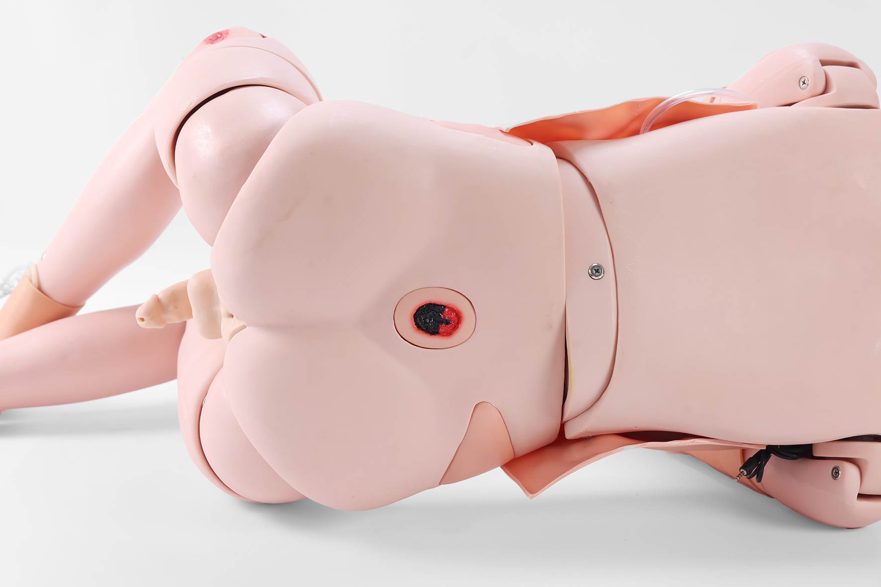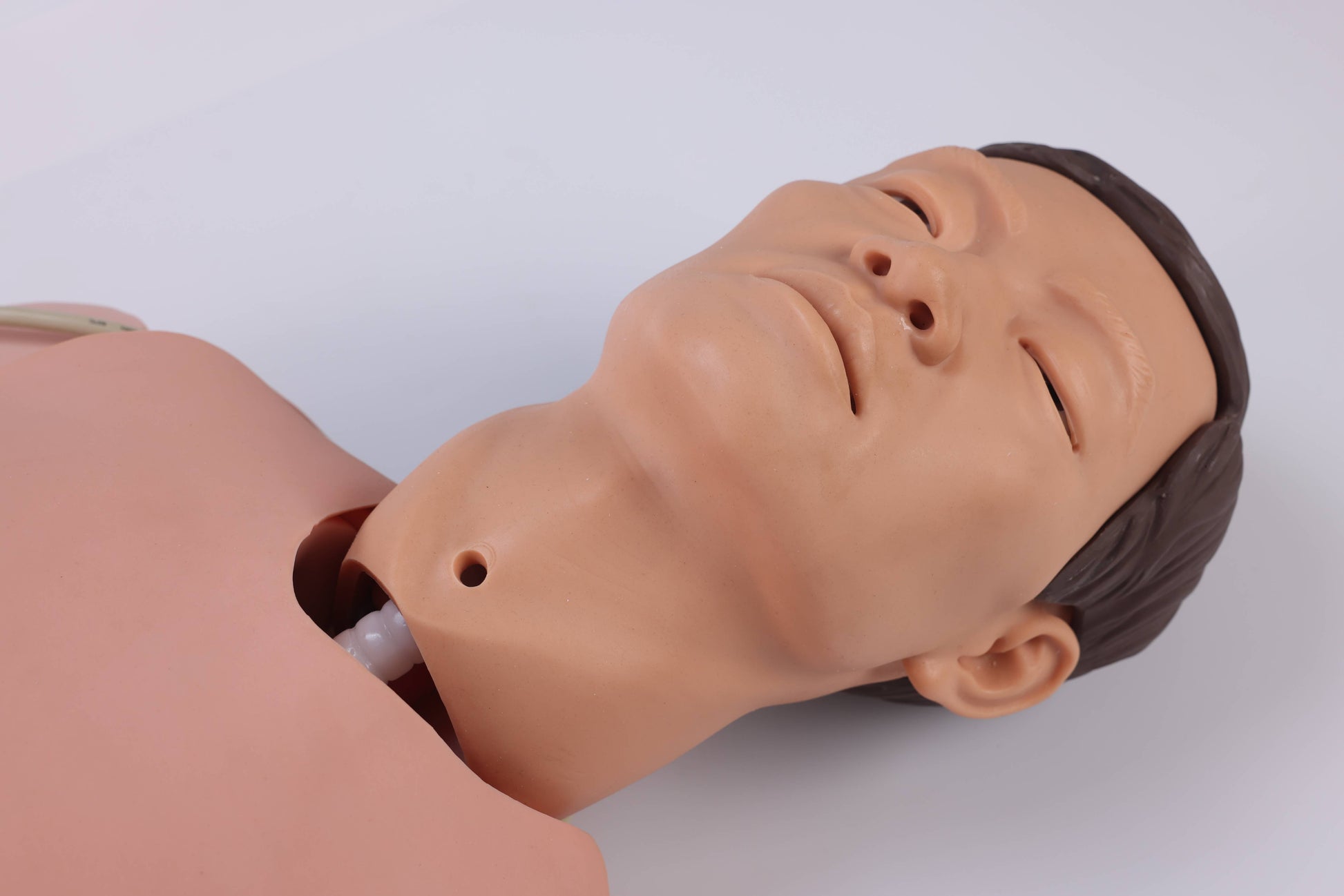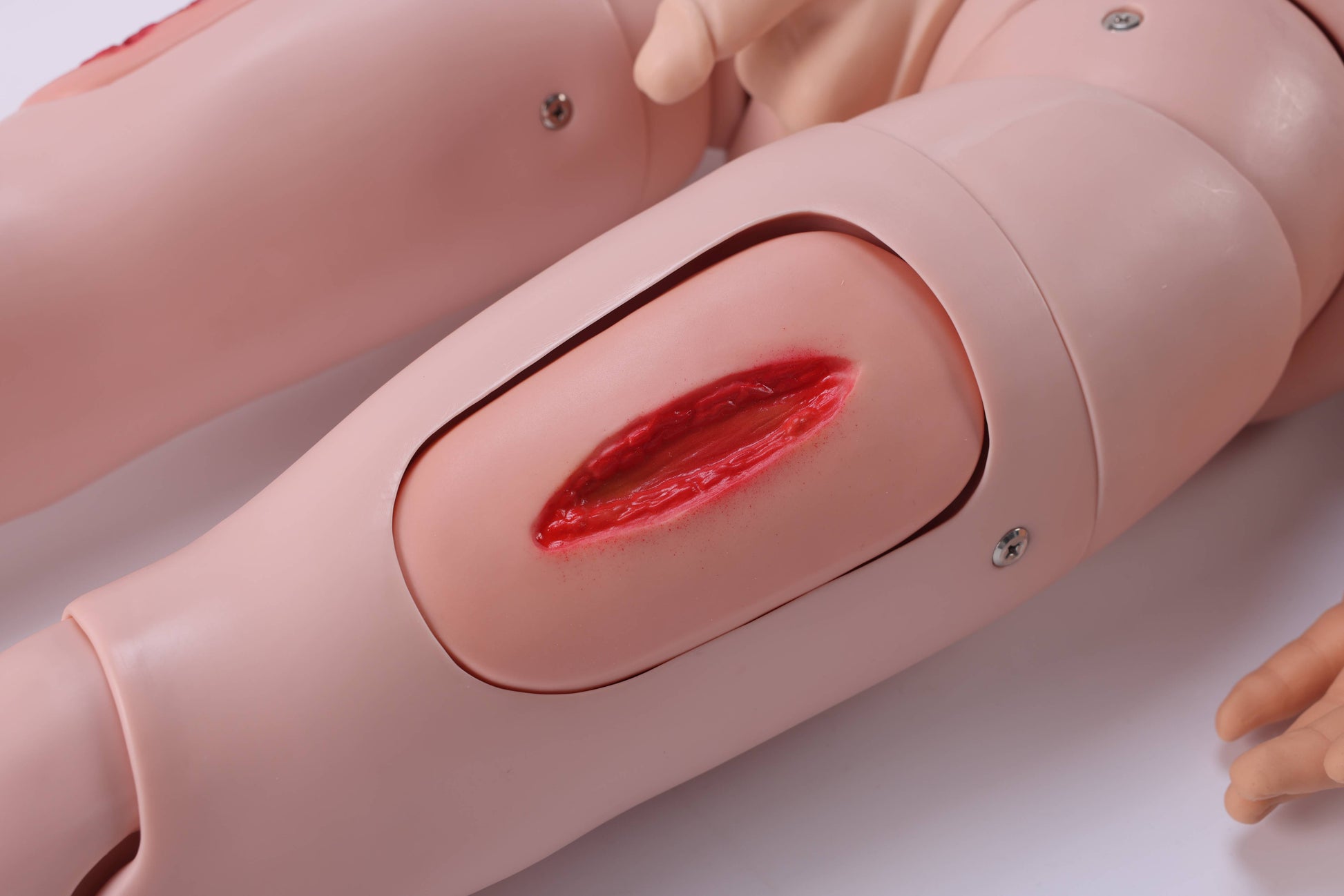 The manikin features highly flexible joints and realistic anatomical details, including lifelike facial features, airways, and perineal structures for various nursing procedures. It supports a range of functions from intubation and catheterization to wound care.