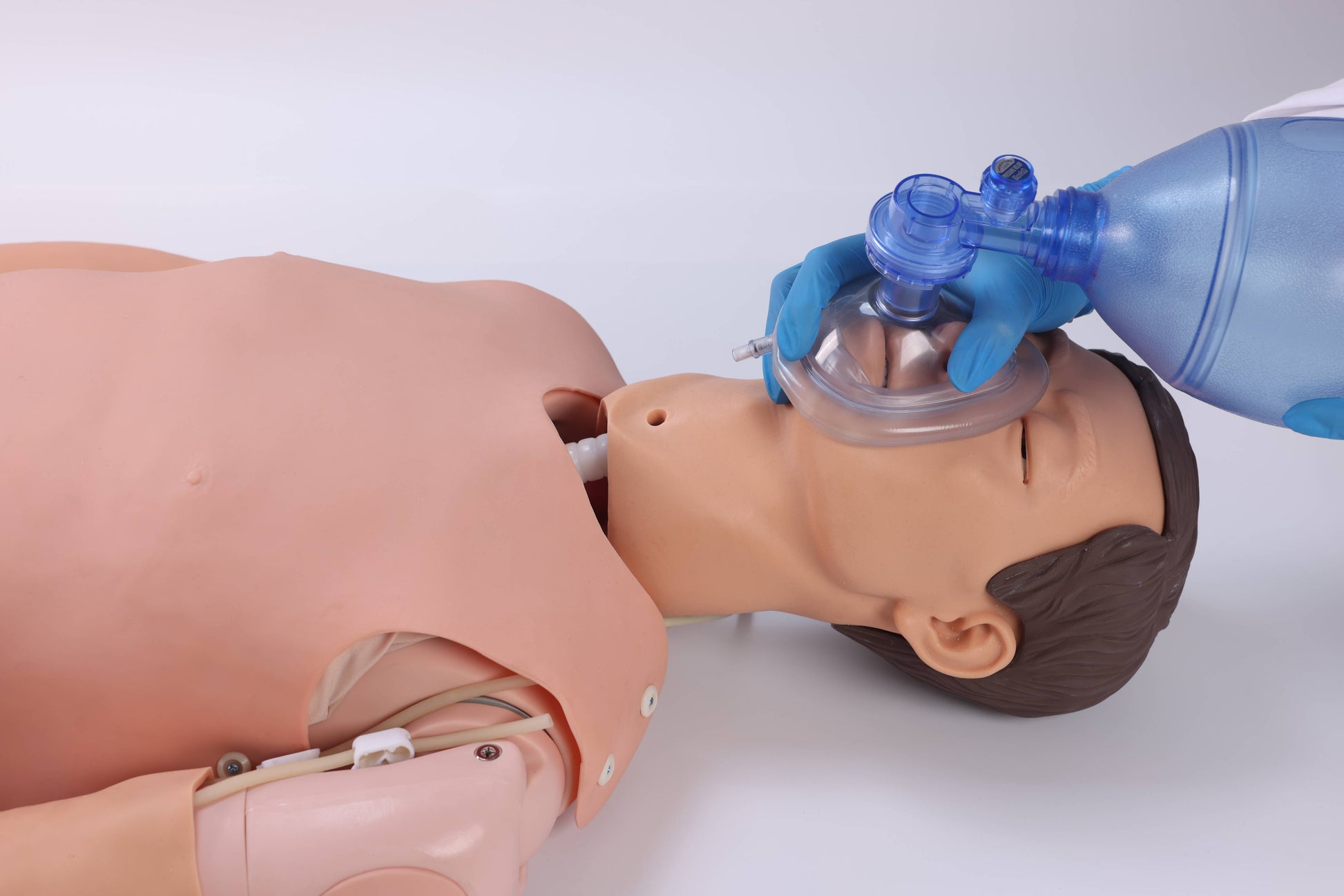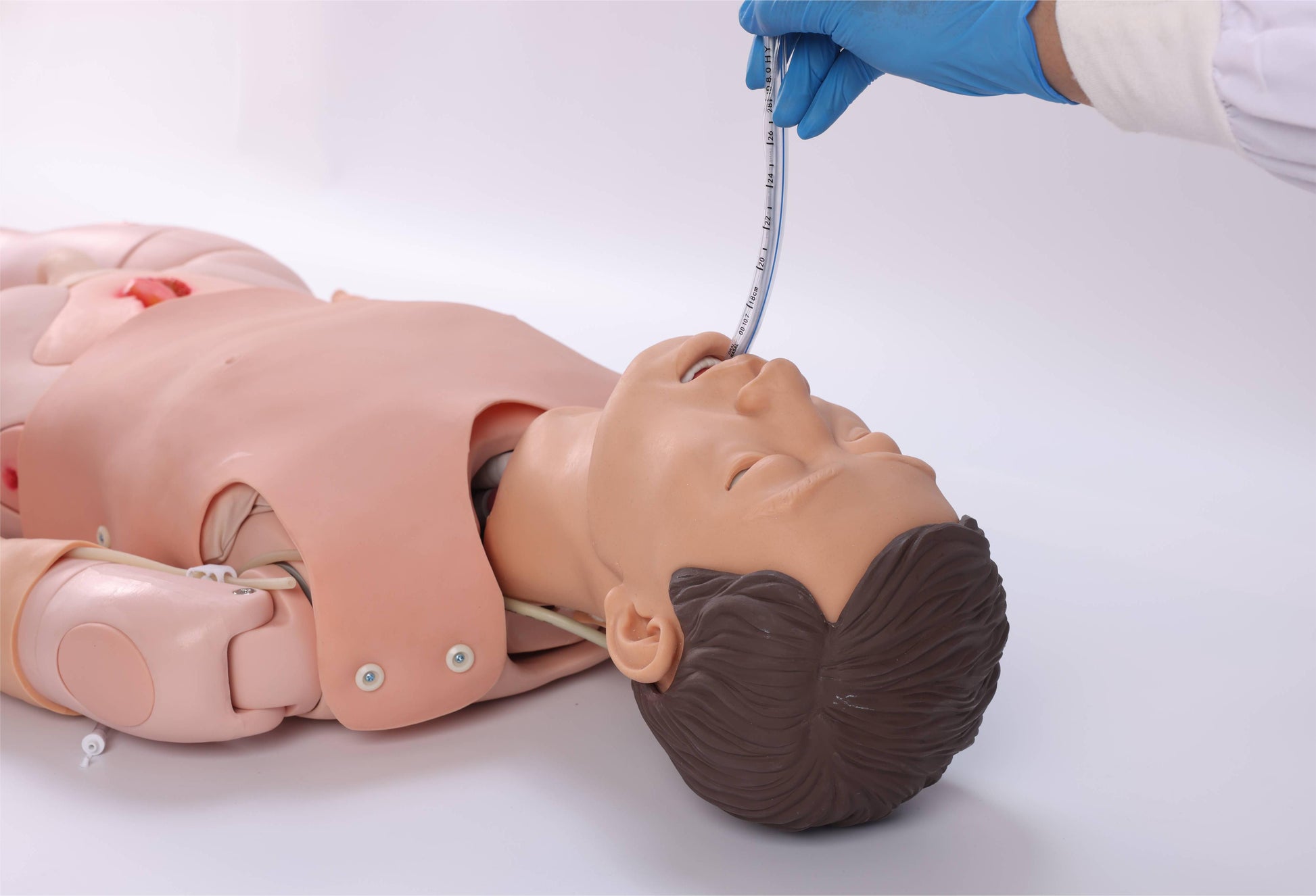 This advanced adult care electronic standardized patient system includes a versatile electronic manikin, interactive teaching software, venous access components, blood pressure measurement tools, and a trauma care module set, designed for comprehensive nursing training.